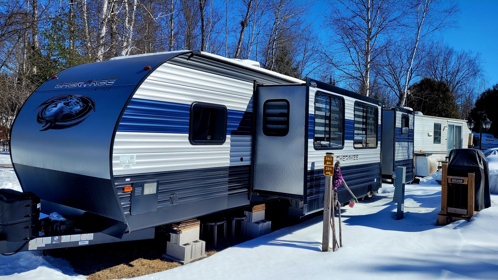 Trailer is 2020 Cherokee 294 BH . Equipped with solar power system. Professionally leveled and winterized. Smoke Free. Only used for 2 seasons. LIKE NEW!