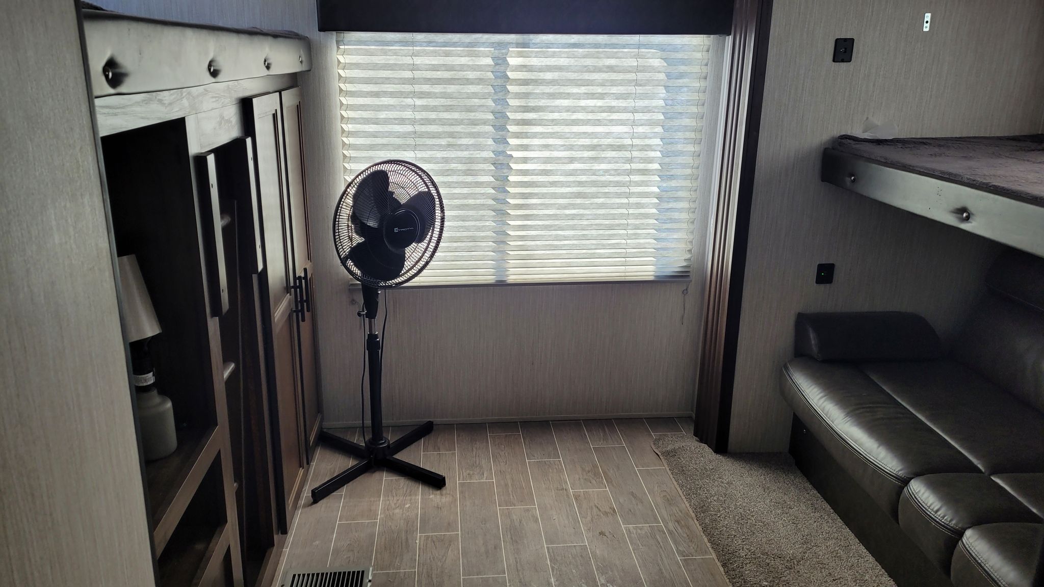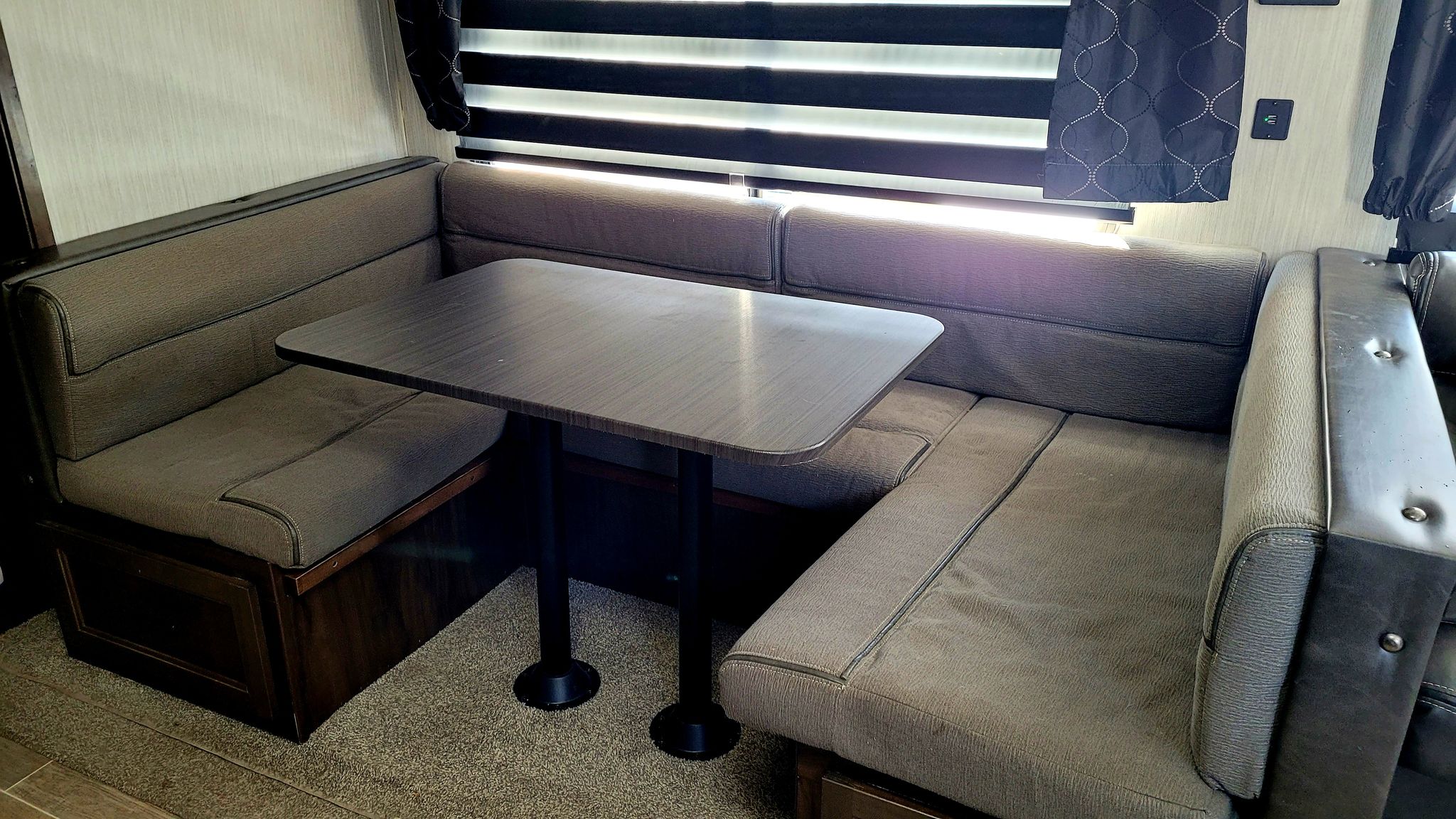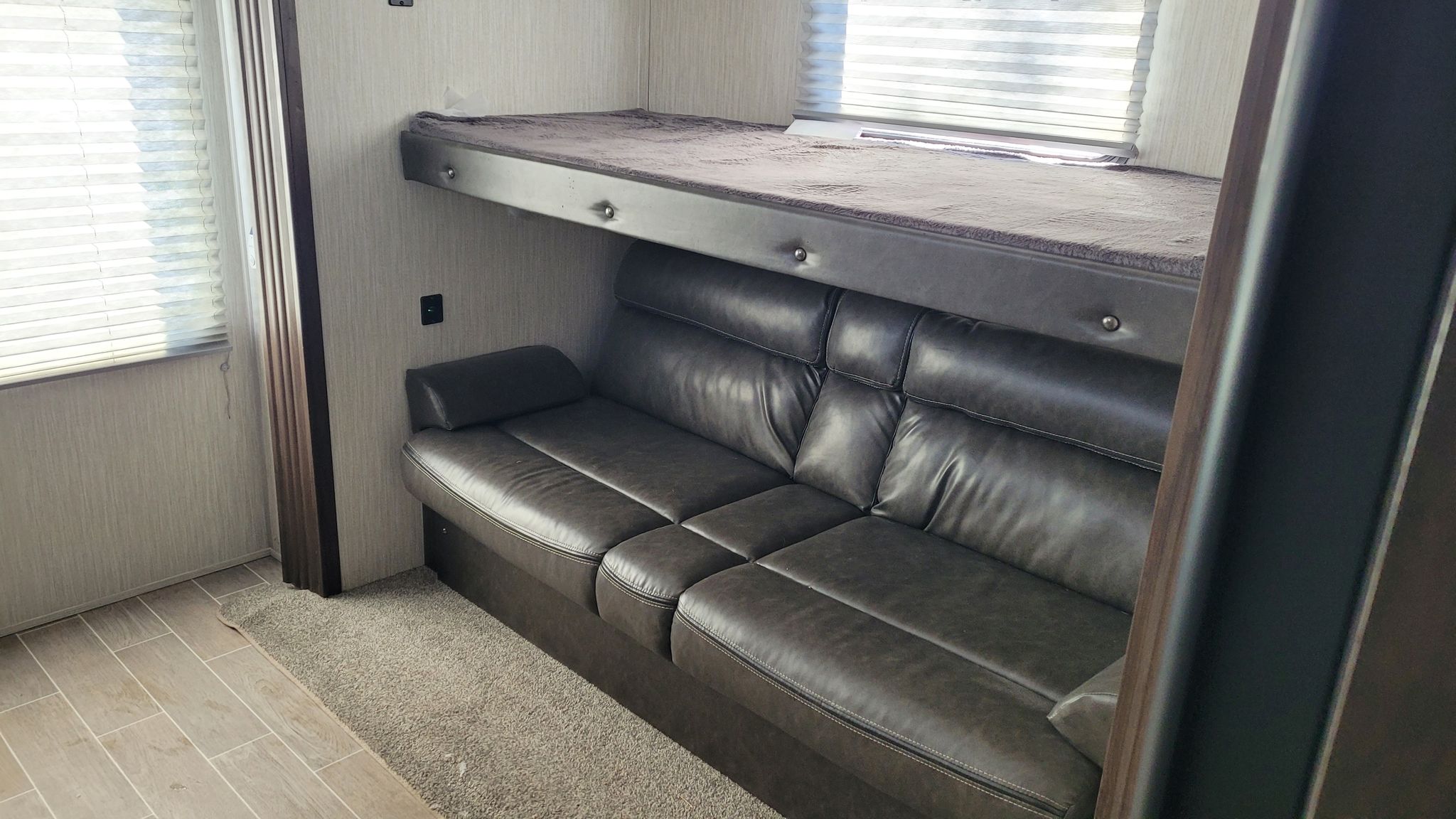 This Trailer is equipped with all amenities. Sleeps 9/ Master Bedroom has FULL Queen Bed. Full size fridge also has stove top and oven. Lots of cupboards for storage, linen closet,. Two closets in master bedroom. 1 full size bathroom/ VERY SPACIOUS ! / U shaped dinette/ leather couches that fold into double beds / electric fireplace . Outdoor Kitchen with fridge/freezer, stove top, sink, storage space and ice maker.