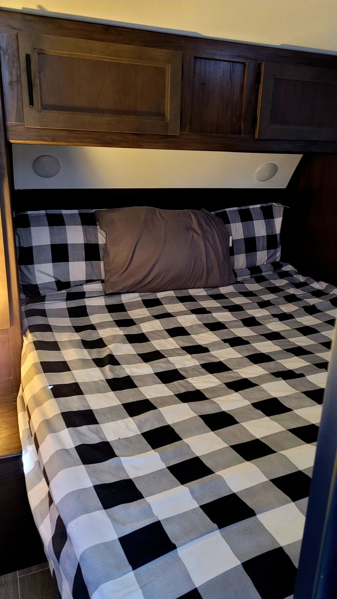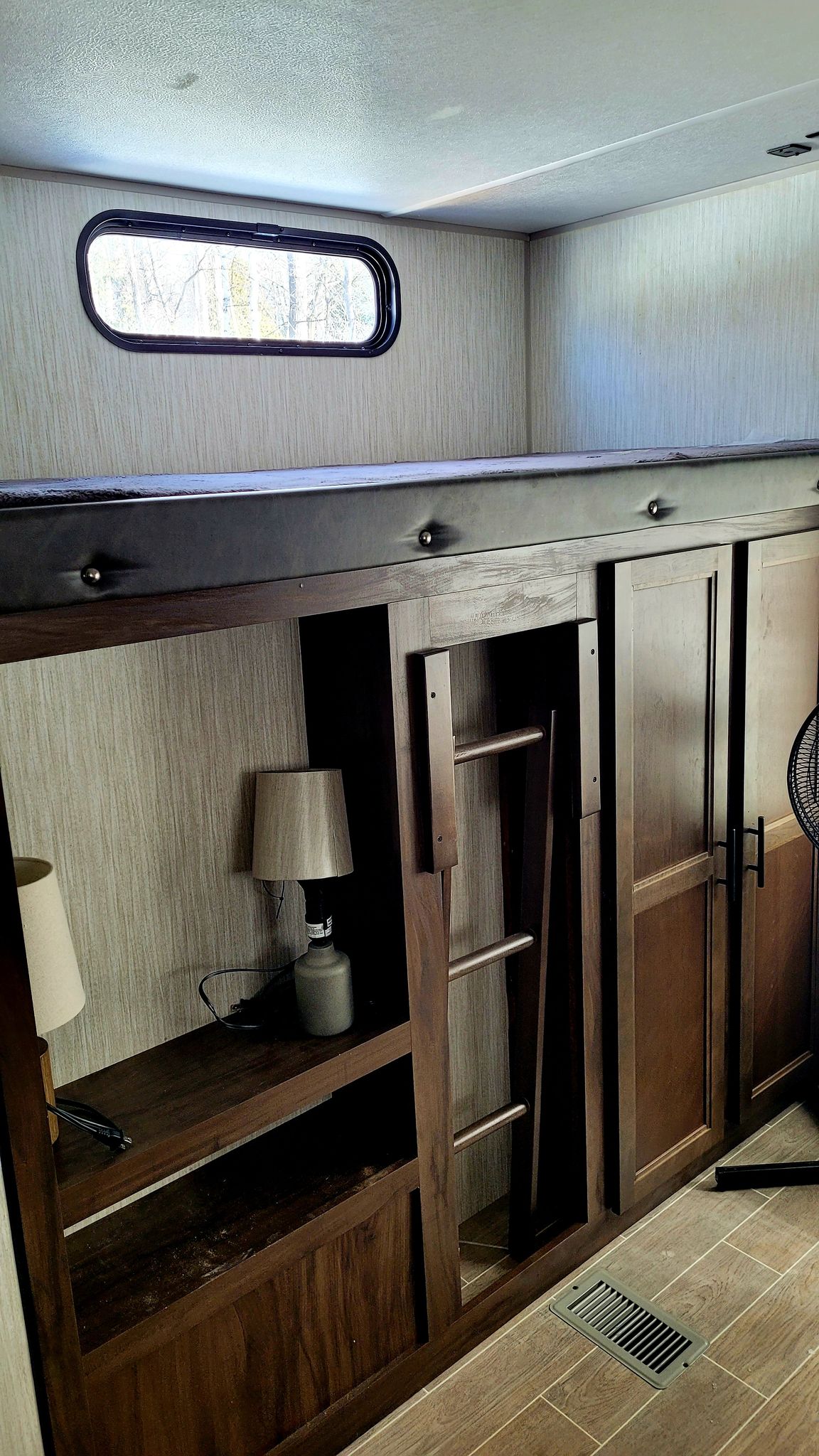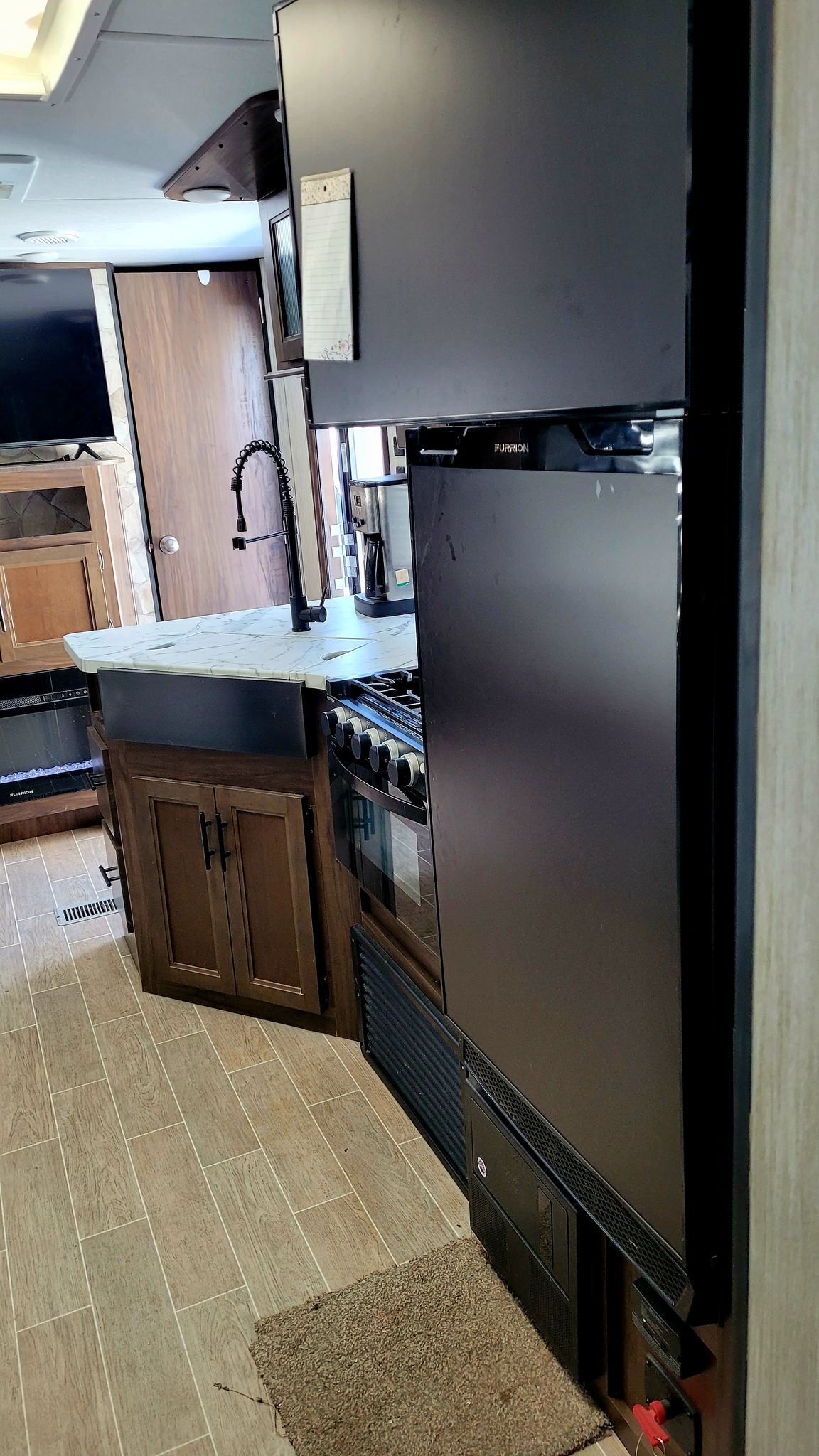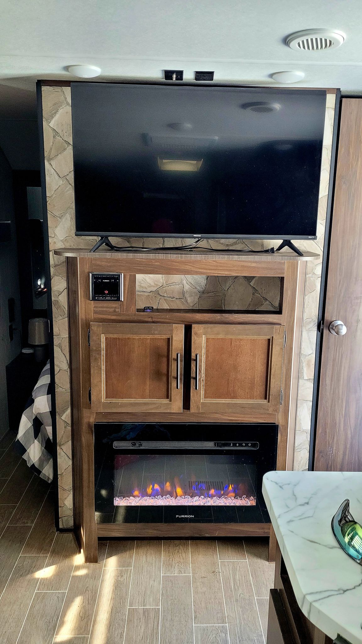 This Trailer is equipped with all amenities. Sleeps 9/ Master Bedroom has FULL Queen Bed. Full size fridge also has stove top and oven. Lots of cupboards for storage, linen closet,. Two closets in master bedroom. 1 full size bathroom/ VERY SPACIOUS ! / U shaped dinette/ leather couches that fold into double beds / electric fireplace . Outdoor Kitchen with fridge/freezer, stove top, sink, storage space and ice maker.