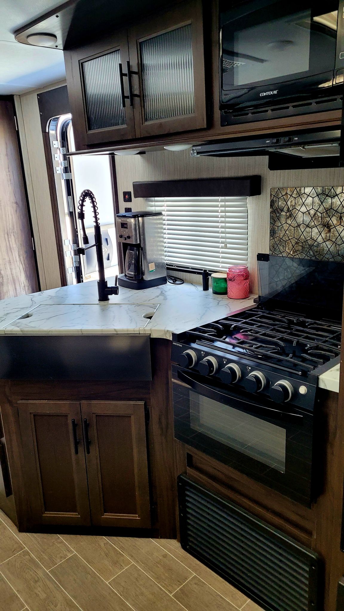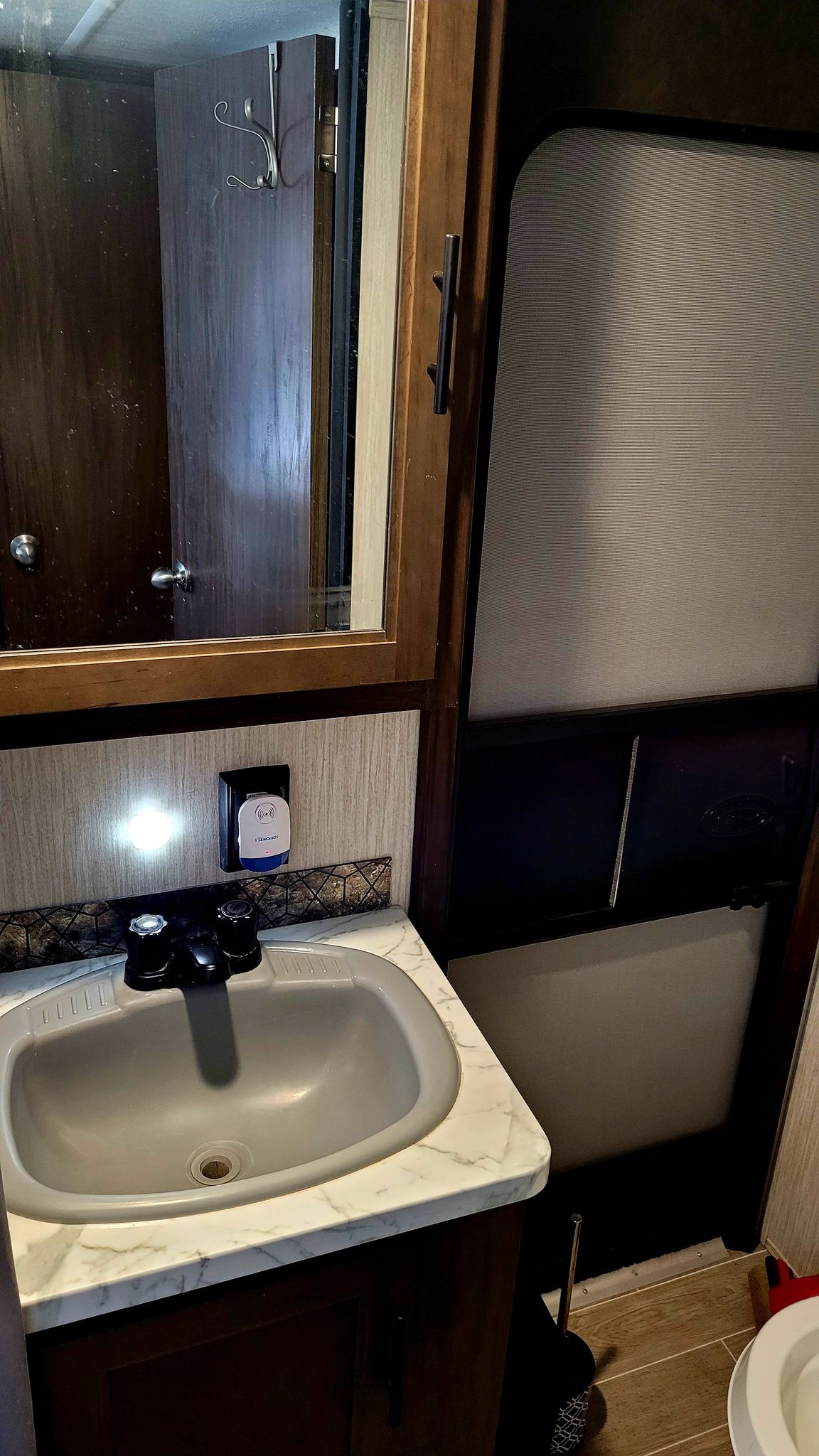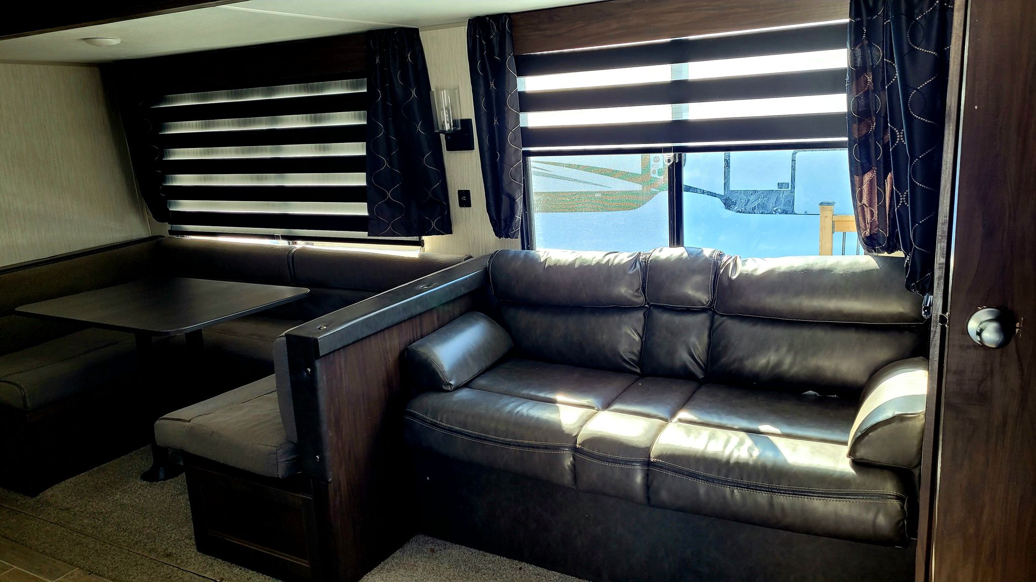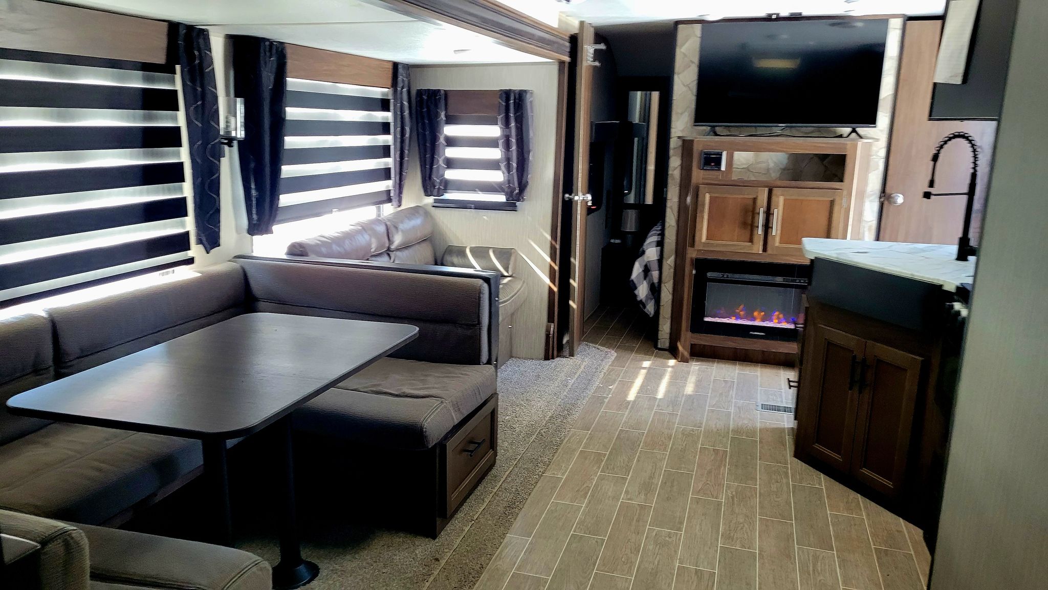 Cette caravane est équipée de toutes les commodités. Elle peut accueillir 9 personnes. La chambre principale est équipée d'un lit Queen complet. Réfrigérateur pleine grandeur, cuisinière et four. Beaucoup de placards de rangement, une armoire à linge. Deux placards dans la chambre principale. 1 salle de bain complète / TRÈS SPACIEUX ! / Le salon est très spacieux, la salle à manger est en forme de U, les canapés en cuir se transforment en lits doubles, la cheminée est électrique. Cuisine extérieure avec réfrigérateur/congélateur, plaque de cuisson, évier, espace de rangement et machine à glaçons.